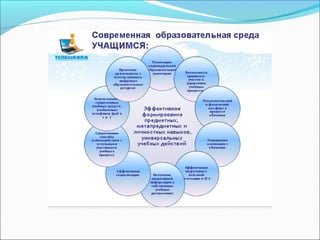 Документ описывает создание информационно-образовательной среды в гимназии №23 Челябинска, ориентированной на раскрытие способностей учеников и подготовку их к жизни в высокотехнологичном мире. Основное внимание уделяется оптимизации образовательного процесса через внедрение современных информационных технологий, что включает обеспечение дистанционного взаимодействия участников образовательного процесса и развитие ICT-компетенций. Программа информатизации гимназии была реализована на основе федерального проекта с целью повышения качества образования и создания условий для саморазвития учащихся.
