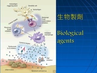 文档讨论了类风湿性关节炎的治疗选择,包括类固醇、非类固醇消炎药、免疫调节剂及生物制剂的新型药物。强调了新药的有效性与副作用,并提到药物使用的原则及如何决策是否使用新药。文章还提倡患者通过生活方式的改变和遵医嘱,促进更好的治疗效果。