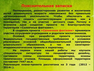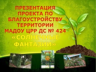Документ описывает проект благоустройства территории детского сада под названием «Солнечные фантазии», направленный на создание условий для всестороннего развития детей дошкольного возраста. В проекте участвуют сотрудники и родители, происходят работы по озеленению и организации тематических уголков на территории площадью 7447 кв.м. Основные цели заключаются в оздоровлении детей и создании уютной, развивающей среды, что будет продолжаться в течение трех лет.