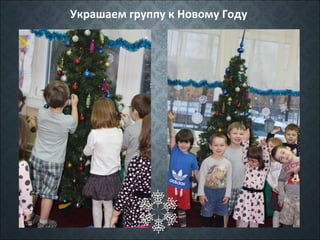 Документ посвящен подготовке группы к новому году, включая праздничные мероприятия и творчество. Основные темы - новогодний утренник 'хоровод вокруг ёлки', зимние поделки и зимние прогулки. Подчеркивается радость от зимнего времени.