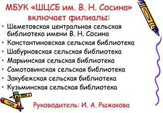 Муниципальное бюджетное учреждение культуры «Шеметовская центральная сельская библиотека имени В. Н. Сосина» представляет итоги своей работы за 2012 год, включая расширение услуг и проведение различных массовых мероприятий. В библиотеке зарегистрировано 5545 пользователей, проведено 356 мероприятий, а также реализуются проекты по экологии и краеведению. Учреждение получило признание как лучшее сельское учреждение культуры Московской области в 2013 году.