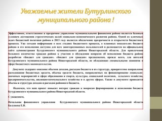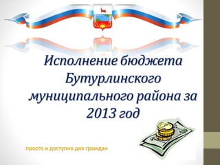 Документ представляет исполнение бюджета Бутурлинского муниципального района за 2013 год, акцентируя внимание на прозрачности и доступности информации для граждан. В нем содержится информация о доходах и расходах бюджета, а также о финансировании ключевых социальных мероприятий. Также предусмотрены меры по привлечению граждан к обсуждению бюджета через проект 'бюджет для граждан'.