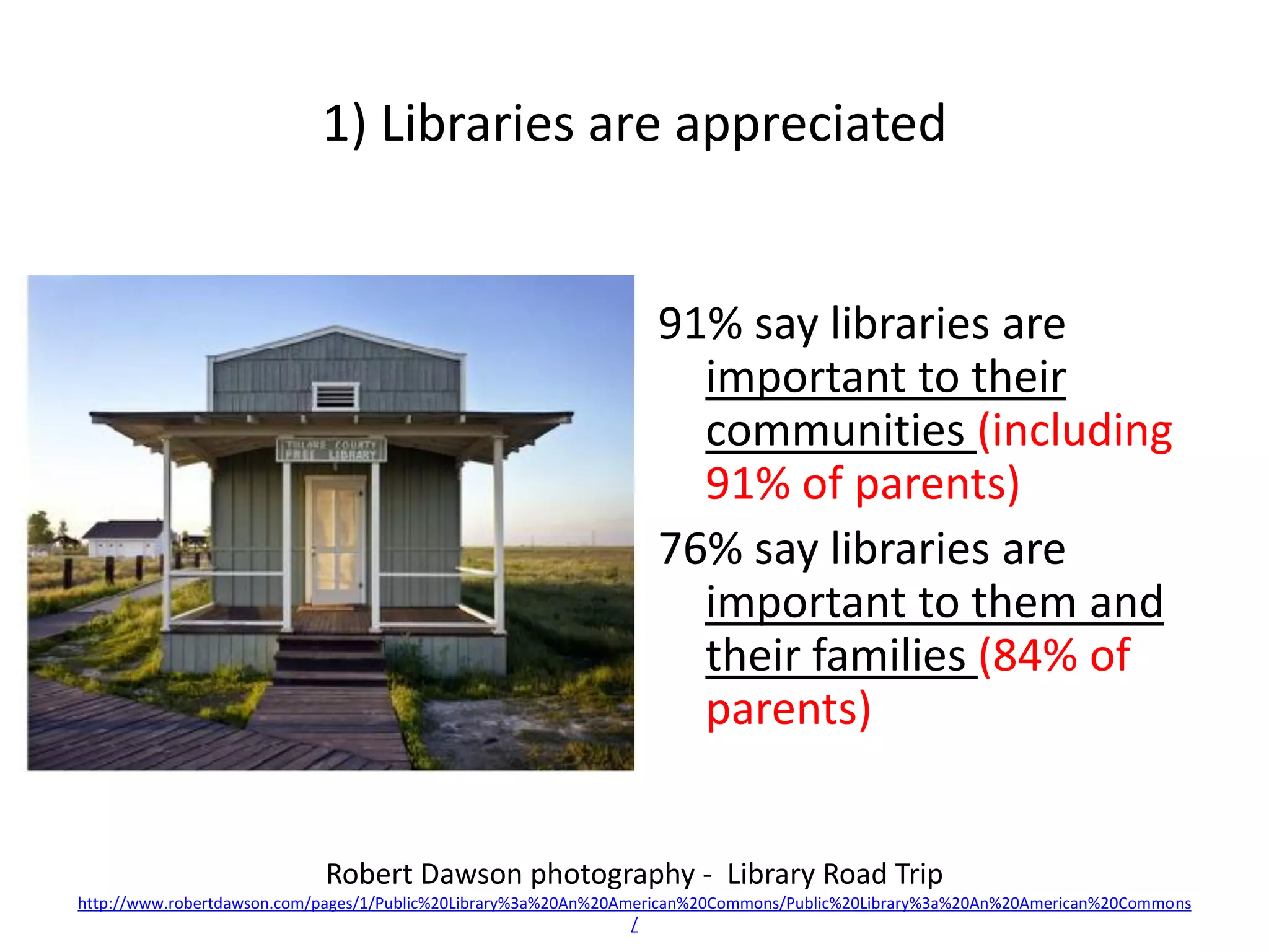 The document summarizes research from the Pew Internet Project on parents' views and use of libraries. It finds that parents highly value libraries and see them as important community institutions, especially for children's education and access to resources. Parents are also more engaged library users than non-parents, utilizing both traditional services like borrowing books as well as new technologies offered by libraries.