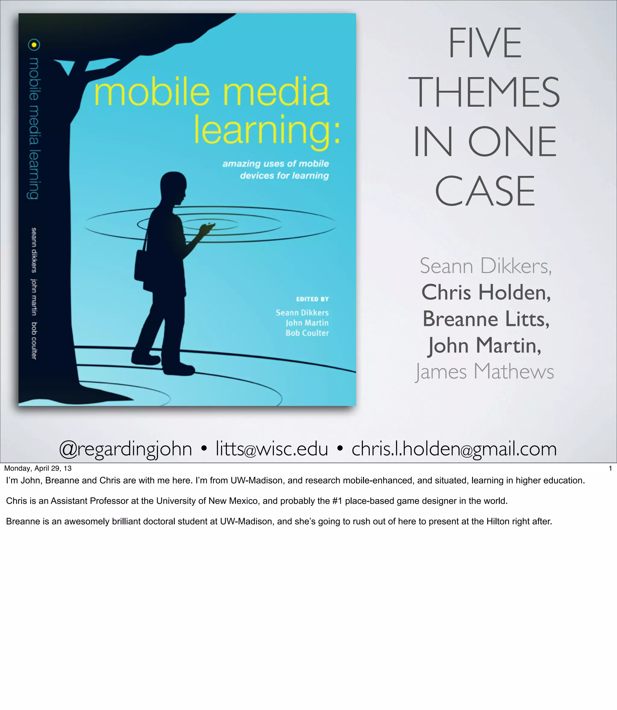 2) Five key themes emerged from participatory design of mobile learning games: encouraging engagement, leveraging place-based experiences, gathering information from the physical environment, fostering systems thinking, and continuous design improvement through collaboration.