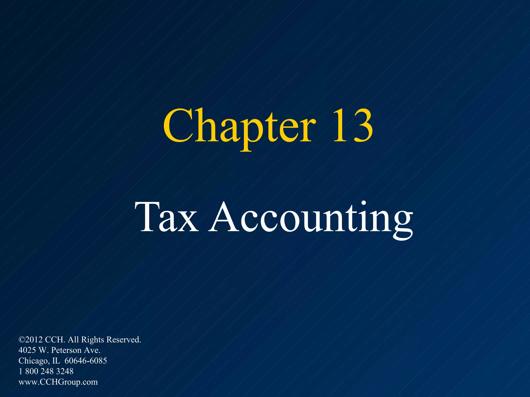This document provides an overview of tax accounting methods and concepts. It discusses the cash method of accounting, which recognizes income when cash is received and expenses when paid. The document provides examples of constructive receipt, where a taxpayer has income even if not yet received in cash. It also briefly mentions the accrual method and hybrid accounting methods. The document appears to be an introductory chapter on tax accounting from a textbook.