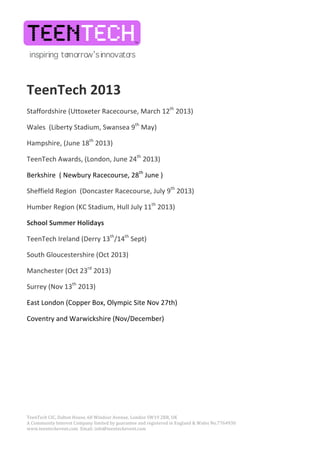 The document lists the dates and locations for various TeenTech events scheduled to take place throughout 2013, including events in Staffordshire, Wales, Hampshire, London, Berkshire, Sheffield, Hull, Ireland, South Gloucestershire, Manchester, Surrey, East London, and Coventry/Warwickshire. It also provides contact information for TeenTech CIC.