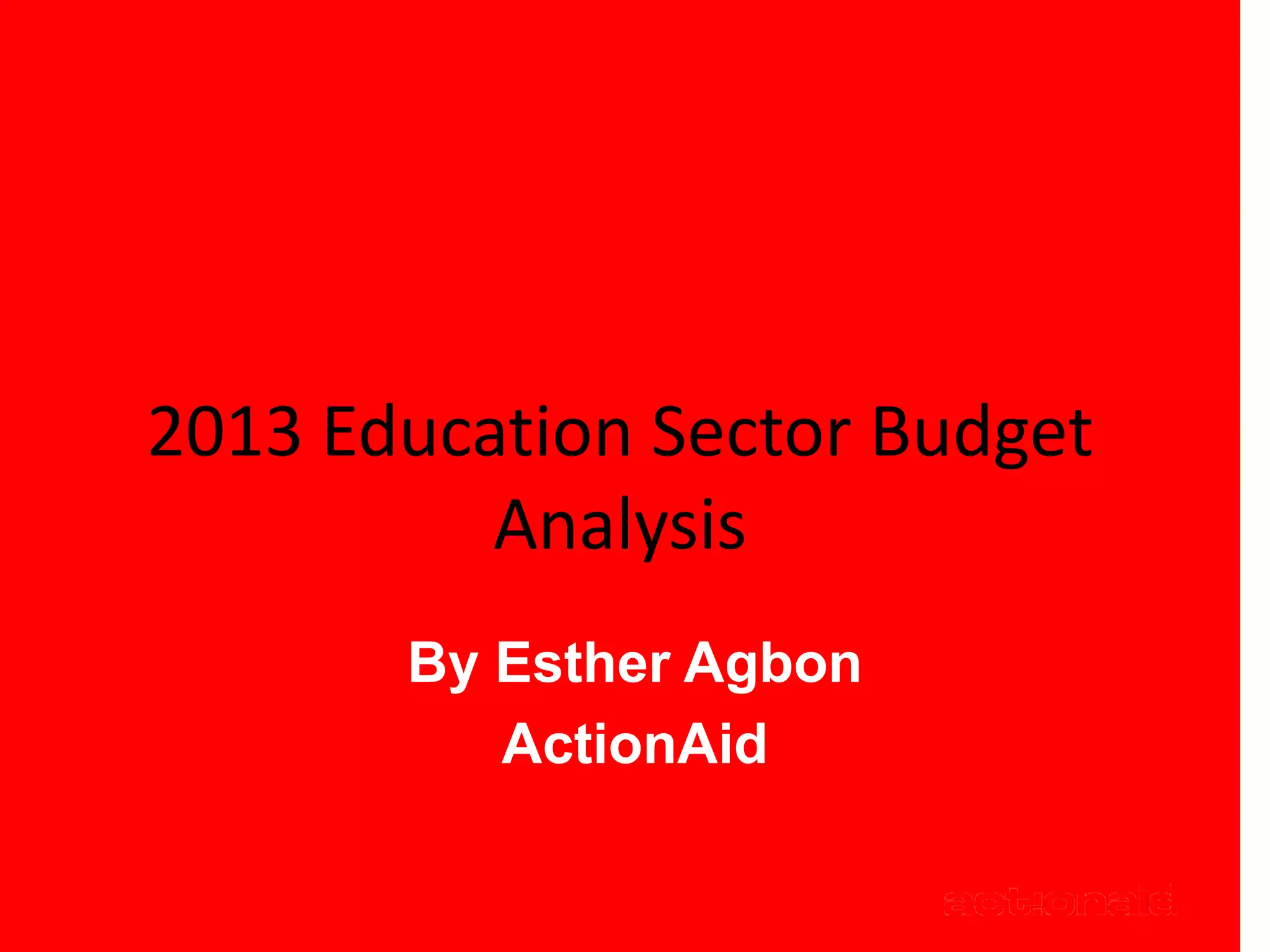 The document analyzes Nigeria's 2013 education sector budget, finding that while the budget has increased nominally in recent years, most funding goes to staff salaries and celebrations rather than capital projects, and agencies supporting disadvantaged groups receive inadequate funding. It recommends reducing allocations for celebrations and allowances to free up funds for improving infrastructure, equipping schools with IT, and properly funding universities.