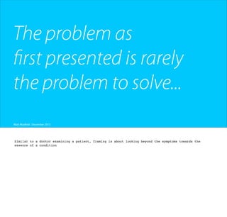 The document discusses the process of framing problems to find innovative opportunities. It defines framing as looking beyond surface-level symptoms to understand the core issues, and examines stakeholders and activities to challenge assumptions. The framing process involves three steps - abstracting the problem to remove constraints, examining activities and stakeholders with fresh perspectives, and interpreting insights to develop a new understanding. Framing requires embracing ambiguity and paradoxes, avoiding premature solutions, and being open to changing frames as new information emerges. The goal is to generate a holistic frame that examines core assumptions and inspires multiple potential solutions.