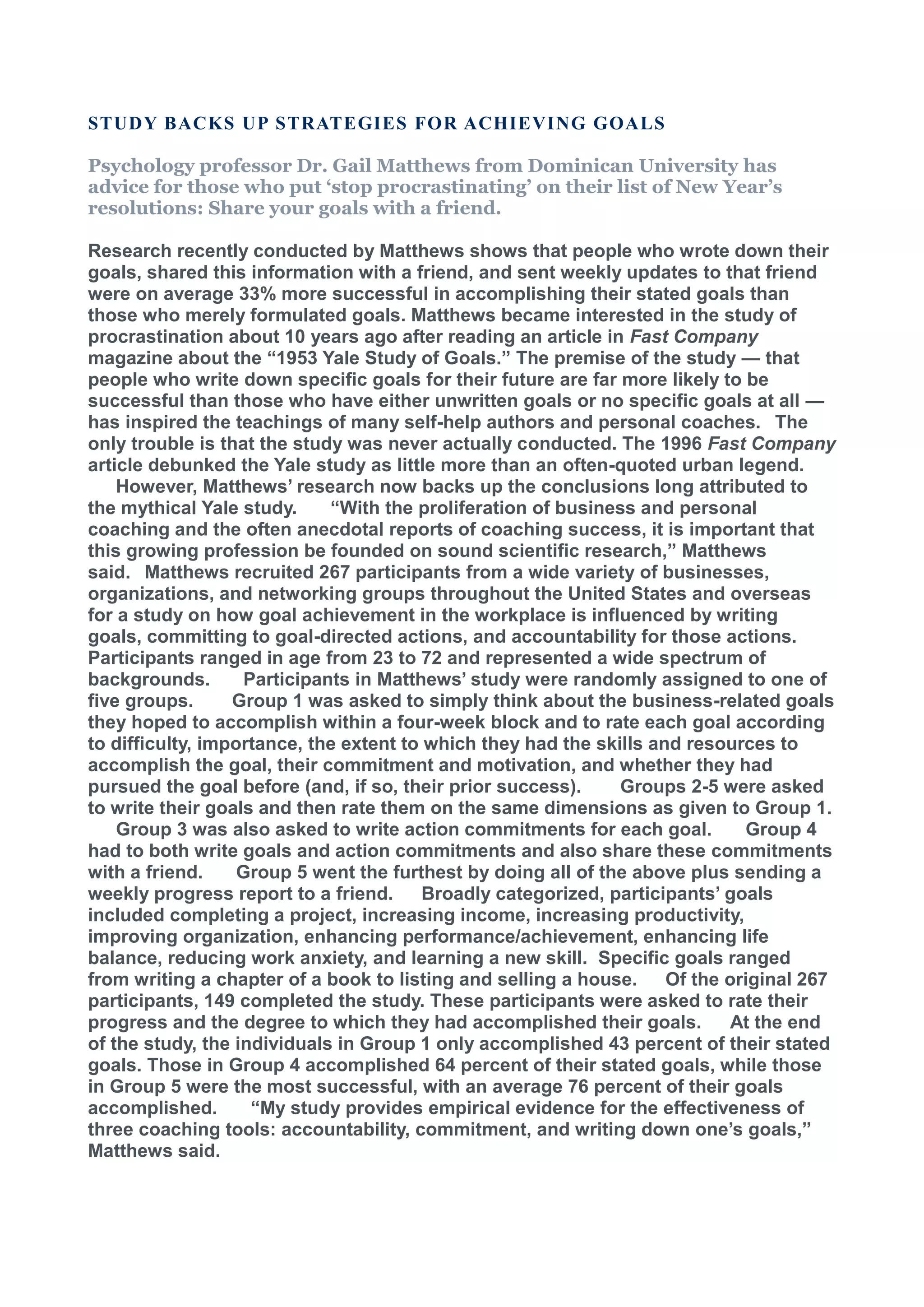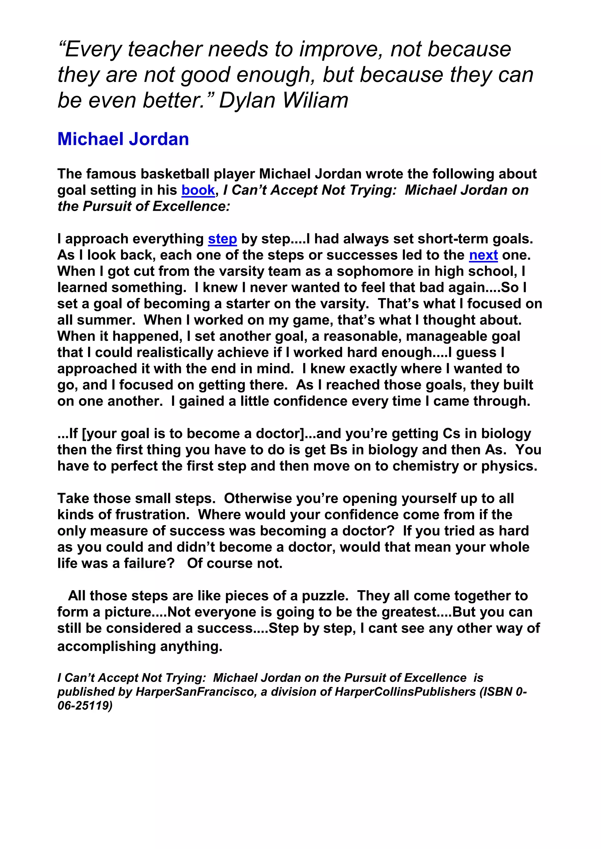 Michael Jordan emphasizes setting specific, achievable short-term goals and taking small incremental steps to achieve long-term goals. He reflects on how setting and achieving a series of short-term goals, such as making the varsity basketball team, built his confidence and led to greater successes. Psychology professor Dr. Gail Matthews conducted a study showing people who wrote down goals, shared them with a friend, and provided weekly updates were 33% more likely to achieve their goals than those who just thought about goals. Her research supports the effectiveness of accountability, commitment to goals and actions, and writing goals down.