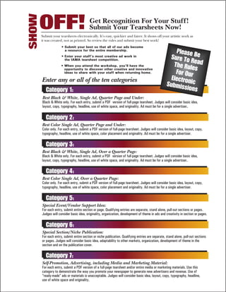 This document provides information about the 2013 IAMA's Tearsheet Competition, including submission categories, judging criteria, rules, and deadlines. Staff are encouraged to electronically submit tearsheets and other materials from their best works across 10 categories by March 29, 2013 for consideration. Categories include things like single ads, sections, and self-promotion materials. Physical submissions are also accepted for some categories.