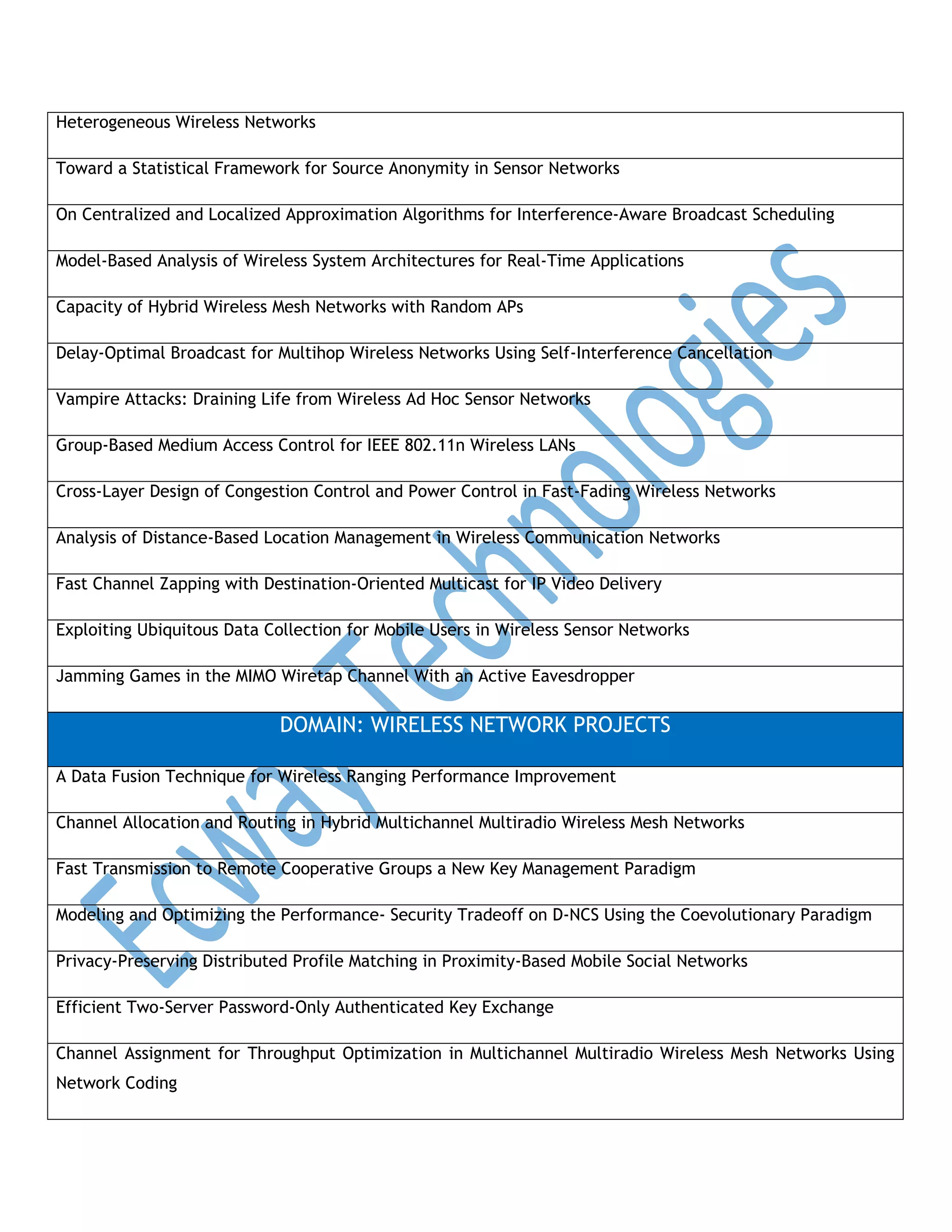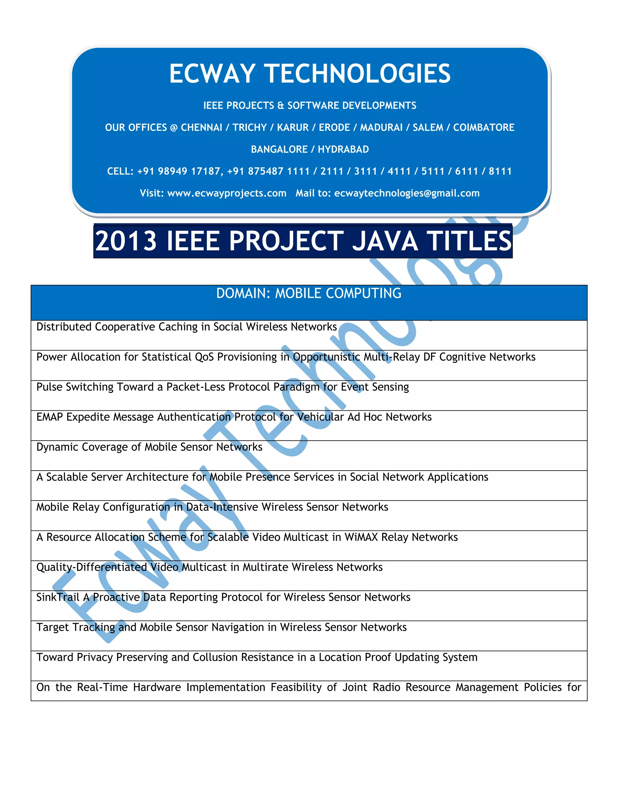 This document lists various 2013 IEEE project titles in domains related to mobile computing, wireless networks, network security, data mining, cloud computing, and parallel/distributed computing. It provides contact information for ECWAY Technologies, an organization based in India that offers related projects and software developments. The project titles are briefly described and cover topics such as distributed caching, power allocation, mobile sensor networks, wireless security protocols, social network applications, data fusion, cloud resource management, and parallel task scheduling.