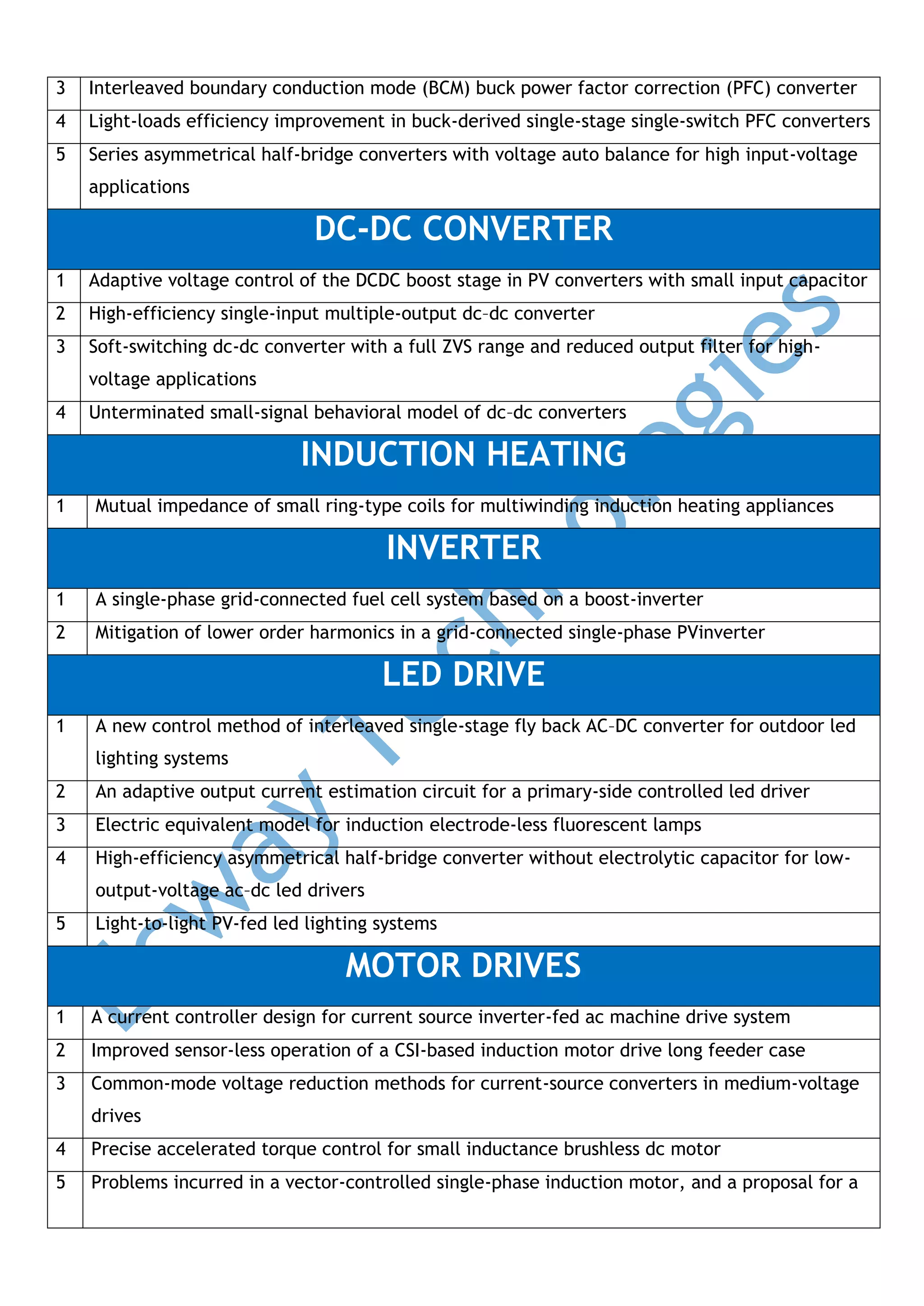 Ecway Technologies provides IEEE projects and software development services for power electronics. It has offices in multiple cities in India. The document then lists over 100 project titles from 2013 in areas like boost converters, buck converters, inverters, motor drives, renewable energy, resonant converters, and more. Project areas include photovoltaics, wind energy, battery charging, uninterruptible power supplies, and other applications.