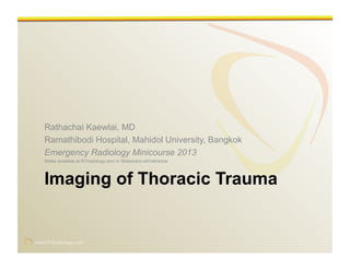 This document provides an overview of imaging techniques used in the evaluation of thoracic trauma. It begins with an introduction to the epidemiology of thoracic injuries and the importance of rapid diagnosis. The initial assessment involves a primary and secondary survey with a focus on airway, breathing and circulation. The imaging survey typically begins with a portable chest x-ray to evaluate for pneumothorax, hemothorax and other injuries followed by an ultrasound to assess for pericardial effusion. Additional sections discuss specific injuries like flail chest, hemothorax and tension pneumothorax that may be seen on CXR. The role of CT in thoracic trauma evaluation is also reviewed.