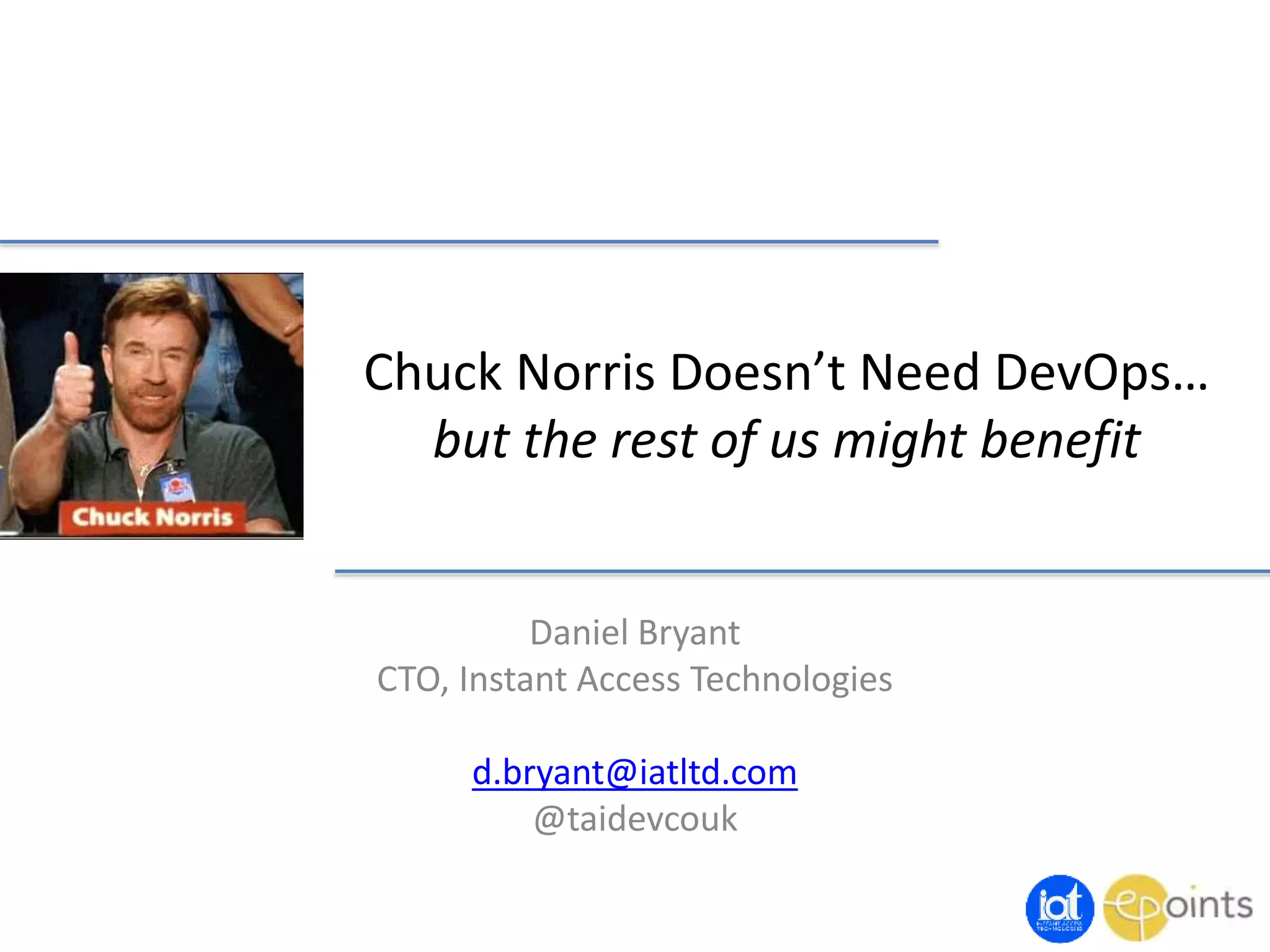 The document discusses the concept of DevOps and its importance in software development, emphasizing collaboration between developers, quality assurance, and operations teams. It highlights the cultural shift needed to adopt DevOps practices, including continuous delivery, automation of quality assurance, and resource management. The author uses humorous references to Chuck Norris to illustrate the challenges faced by teams compared to an idealized one-man coding setup.