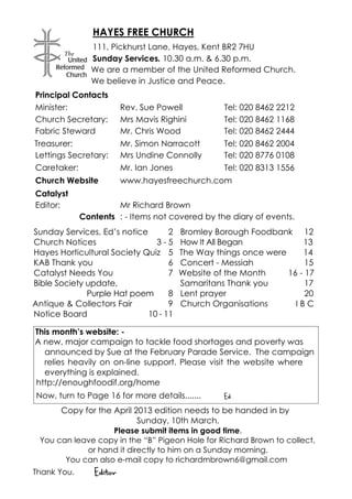 This document provides information about Hayes Free Church (URC) in March 2013, including notices about upcoming services and events. The church minister Rev. Sue Powell encourages members to do random acts of kindness during Lent. Details are also provided about Bible study groups, women's fellowship, and other church organizations.