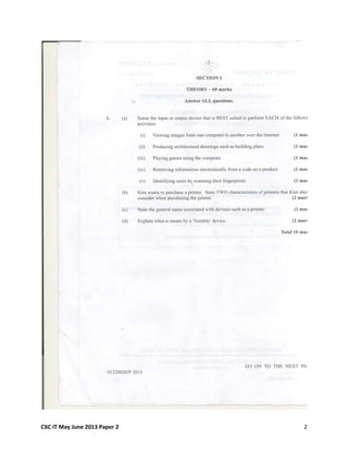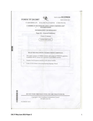 This document appears to be a 12 page exam paper for CXC IT from May/June 2013. It likely contains multiple choice and/or short answer questions testing Information Technology concepts. However, without seeing the actual questions or content, it is difficult to provide any meaningful high-level summary of the key information and topics addressed in the exam.