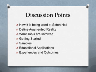 The document discusses integrating augmented reality (AR) with mobile devices in education at Seton Hall University, outlining various applications and tools used. It highlights the creation of 'auras'—interactive AR products—by students, focusing on multimedia lessons and virtual campus tours, as well as profiling historical figures. Aurasma is introduced as a leading AR platform, emphasizing the benefits of interactive learning experiences and collaborative tasks in the classroom.