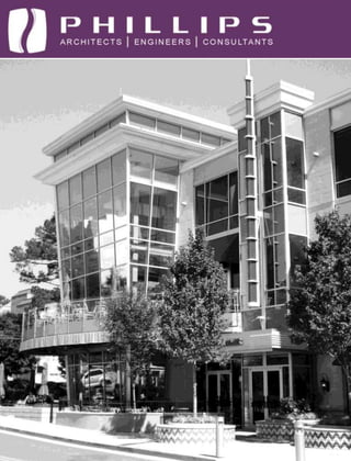 The document describes Phillips Partnership, an architectural and engineering firm based in Atlanta, Georgia. It provides an overview of the firm's services, experience, resources, and notable projects. Key points include that Phillips Partnership is a full-service A&E firm dedicated to exceeding client expectations in service, design, and performance. It has extensive experience in retail, mixed-use, multi-family, hospitality, and office design. Notable past projects include Plaza Midtown, The District at Howell Mill, and Town Brookhaven.