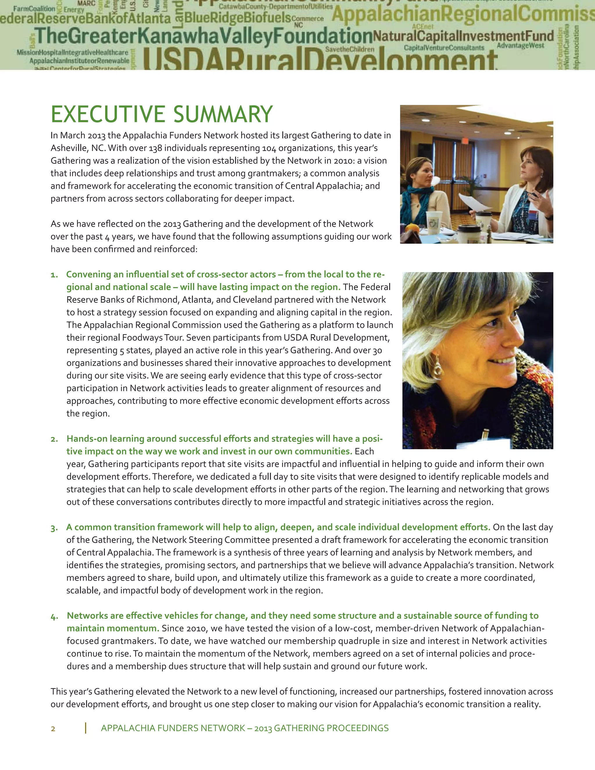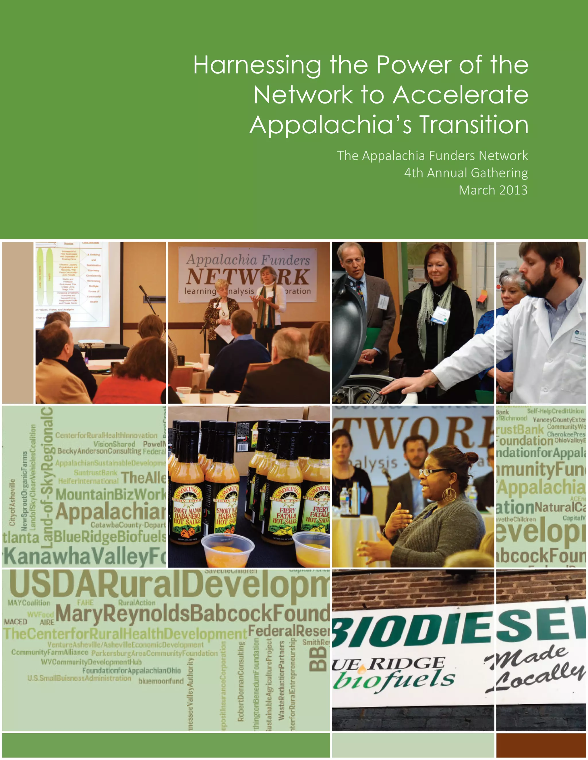 The Appalachia Funders Network held its largest annual gathering to date in Asheville, North Carolina in March 2013. With over 138 individuals from 104 organizations attending, the gathering aimed to deepen relationships between grantmakers, develop a common framework for accelerating Appalachia's economic transition, and foster cross-sector collaboration. Participants engaged in site visits focused on promising sectors like local food, energy, and healthcare. Key lessons included the need to build robust support systems for entrepreneurs, increase demand for local food through education and branding, and leverage partnerships between different organizations. The gathering reinforced the Network's approach of convening cross-sector actors and facilitating hands-on learning to inform members' work and investments.