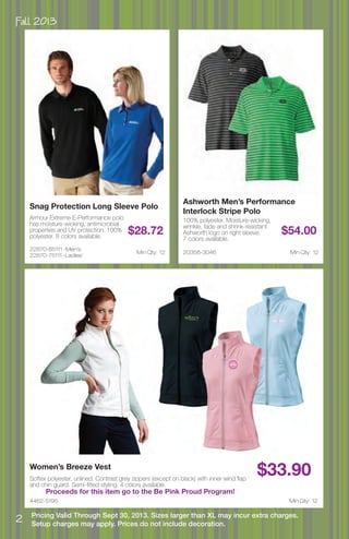 This document provides pricing and product details for various seasonal branded merchandise items available from Halo. It includes polos, vests, shirts, caps, tumblers, water bottles, sunglasses, and other items. Prices range from $0.52 for digital take home bags to $54 for performance polos. Minimum order quantities and any setup fees are specified for each item. The pricing is valid through September 30, 2013.