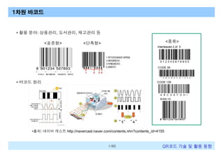 • 바코드는 수평방향, 2차원 바코드는 수평 및 수직방향으로 정보 수록