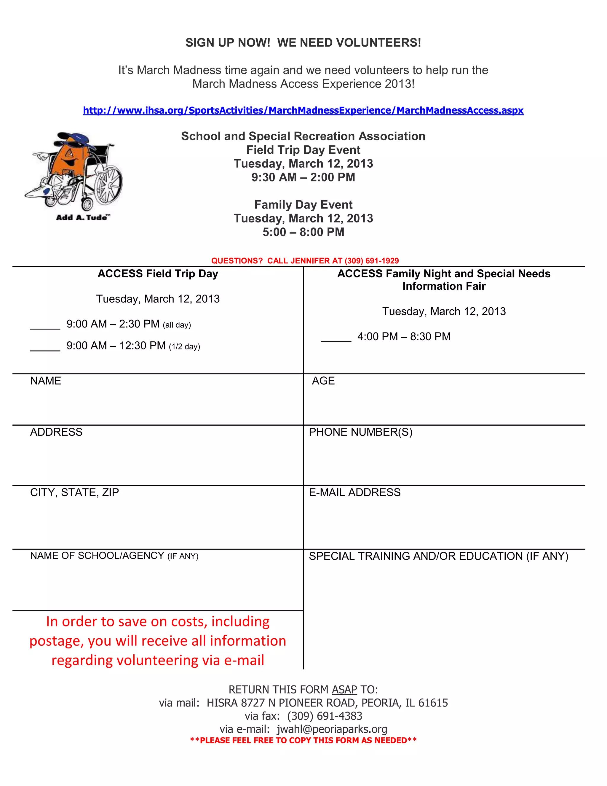 The document advertises the need for volunteers for the March Madness Access Experience 2013. It provides information on two field trip events on March 12th - one in the morning for schools and another in the evening for families. It includes a volunteer sign-up form requesting name, address, phone, email, affiliation, training, and to return the form to Jennifer Wahl at the given address, phone or email.