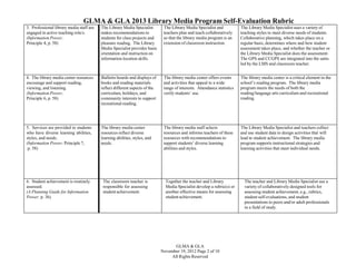 The document provides a rubric for evaluating library media programs at basic, proficient, and exemplary levels across four categories: student achievement and instruction, staffing, facilities/access/resources, and administrative support. Each category contains multiple target indicators describing the characteristics of programs at each evaluation level, with exemplary programs exceeding expectations for proficient programs.