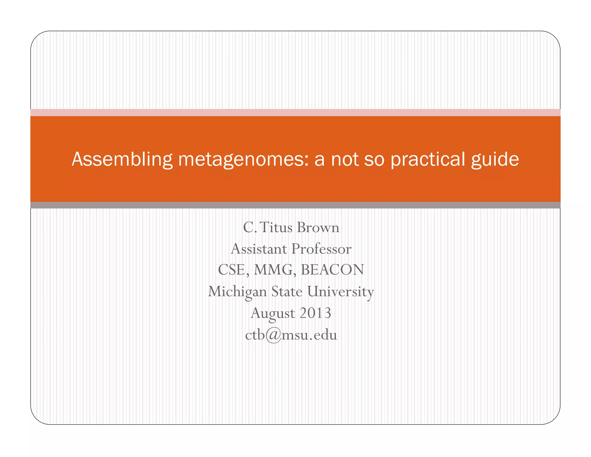 This document provides an overview of the Battle Creek Metagenomics Pipeline for assembling large, complex metagenomes. The pipeline first uses digital normalization techniques like Diginorm to equalize coverage and remove redundant reads. It then partitions the reads into "groups" to separate genomes. Smaller partitions are assembled, while larger ones are further processed. The result is contigs that can be annotated and analyzed. Key aspects of the pipeline are the use of digital normalization and partitioning methods to improve scaling and allow assembly of very large metagenomic datasets.