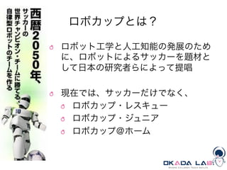 ロボカップとは? ! ロボット工学と人工知能の発展のため に、ロボットによるサッカーを題材と して日本の研究者らによって提唱 ! 現在では、サッカーだけでなく、 !