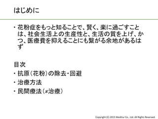 は、社会生活上の生産性と、生活の質を上げ、か つ、医療費を抑えることにも繋がる余地があるは ず 目次 抗原(花粉)の除去・回避 治療方法 民間療法(≠治療) Copyright (C) 2013 Meditur Co., Ltd. All Rights Reserved.
