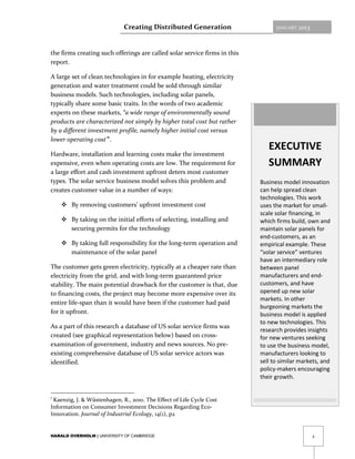 The document presents a research project analyzing how innovative business models can enhance the diffusion of sustainable technologies, particularly in solar energy. It highlights the 'solar service' model, where firms finance and maintain solar installations for customers, thus eliminating upfront costs and making solar power more accessible. The findings emphasize the critical entrepreneurial effort required to build these intermediary ventures and the importance of strategic processes like tutoring and cycling among multiple negotiations to successfully establish such business models.
