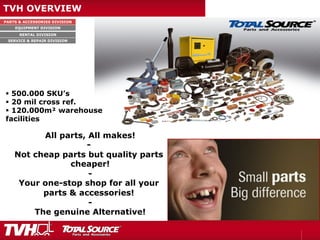 TVH is a company with four divisions: parts & accessories, equipment, rental, and service & repair. It offers a wide range of parts and internal handling equipment. The document discusses TVH's overview, including its large parts catalogue and warehouse facilities. It also discusses challenges with existing applications and the benefits of application modernization, SOA, cloud computing, and other technologies to create a flexible IT architecture based around business processes and services. This would involve model-driven development, integrating cloud-based and mobile applications, and addressing issues like enterprise mobility and BYOA.
