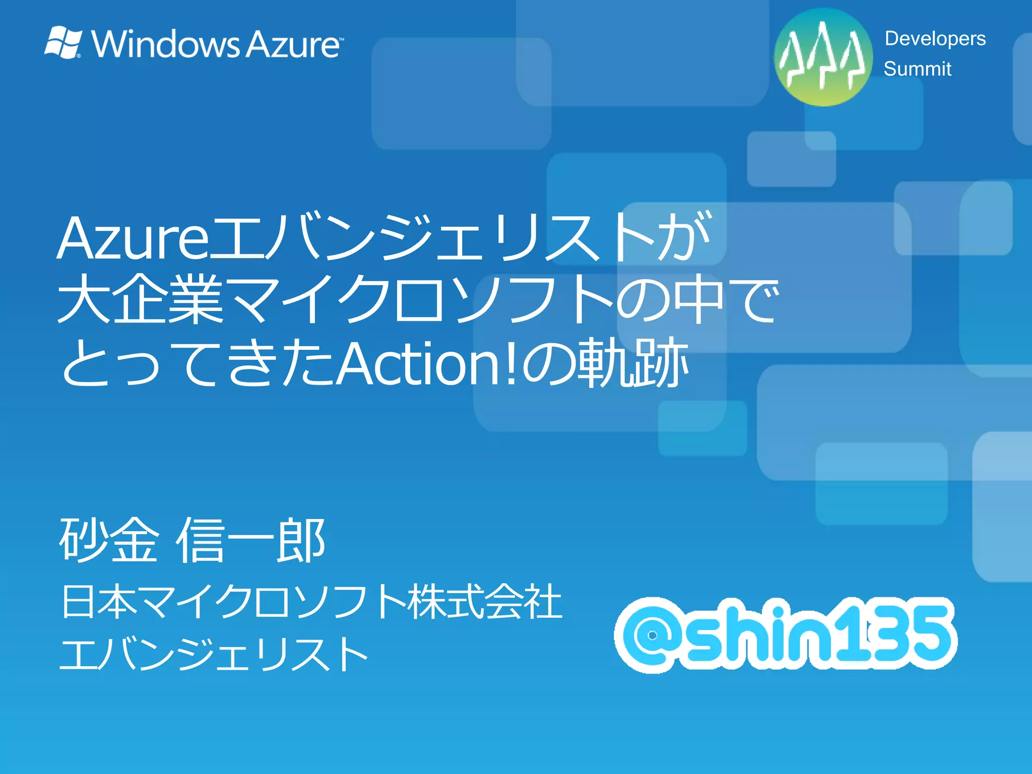 デブサミ2013資料【15-D-3】Azureエバンジェリストが大企業マイクロソフトの中でとってきたAction!の軌跡