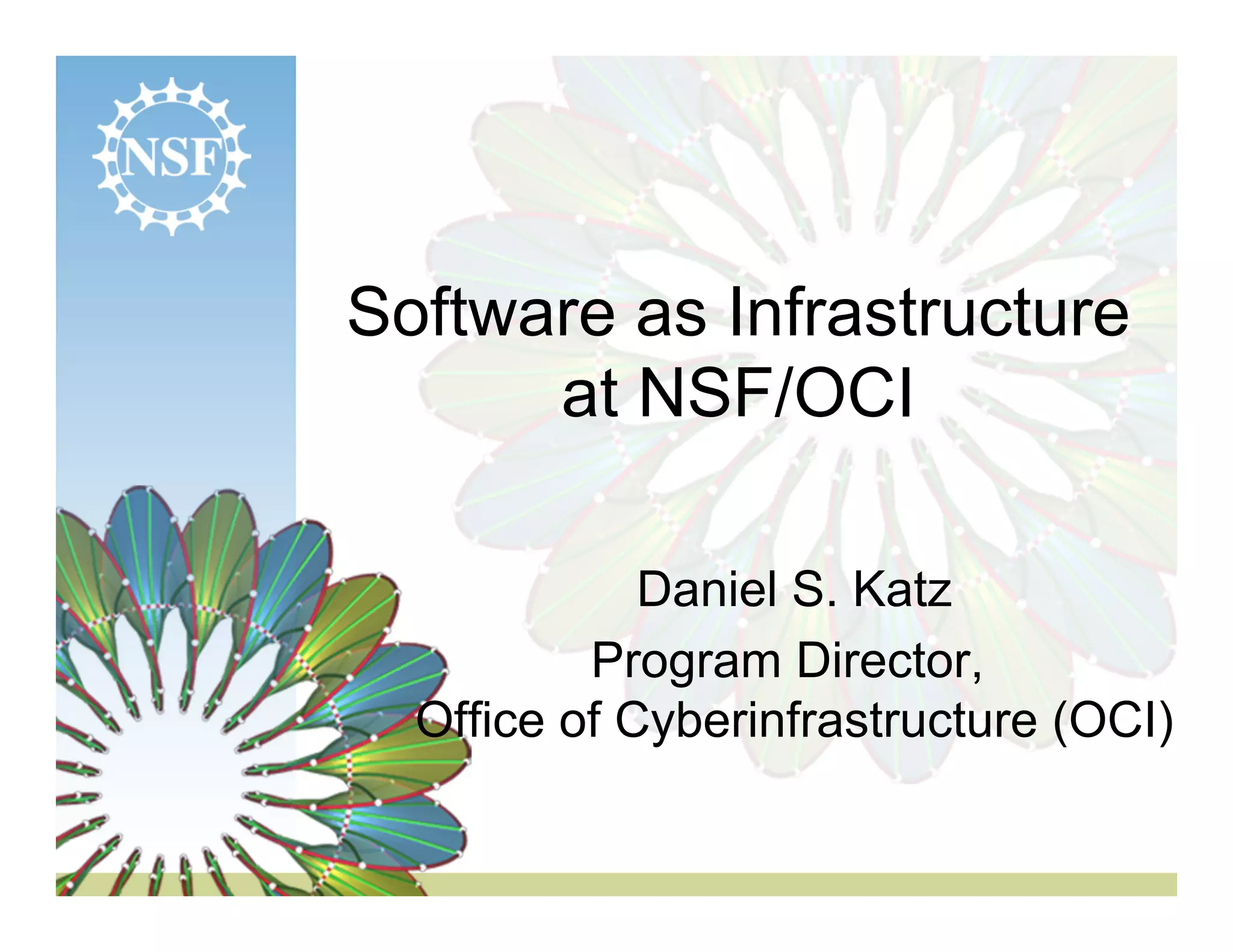 The document discusses the significance of software as infrastructure in advancing science and engineering, emphasizing the growing need for advanced cyberinfrastructure to support large-scale projects like the LHC and long-tail science research. It outlines NSF initiatives aimed at integrating software resources and providing support for software development, maintenance, and education in research environments. Key themes include the challenges of data management, the importance of community governance, and the necessity for sustainable software solutions to enhance interdisciplinary collaboration.