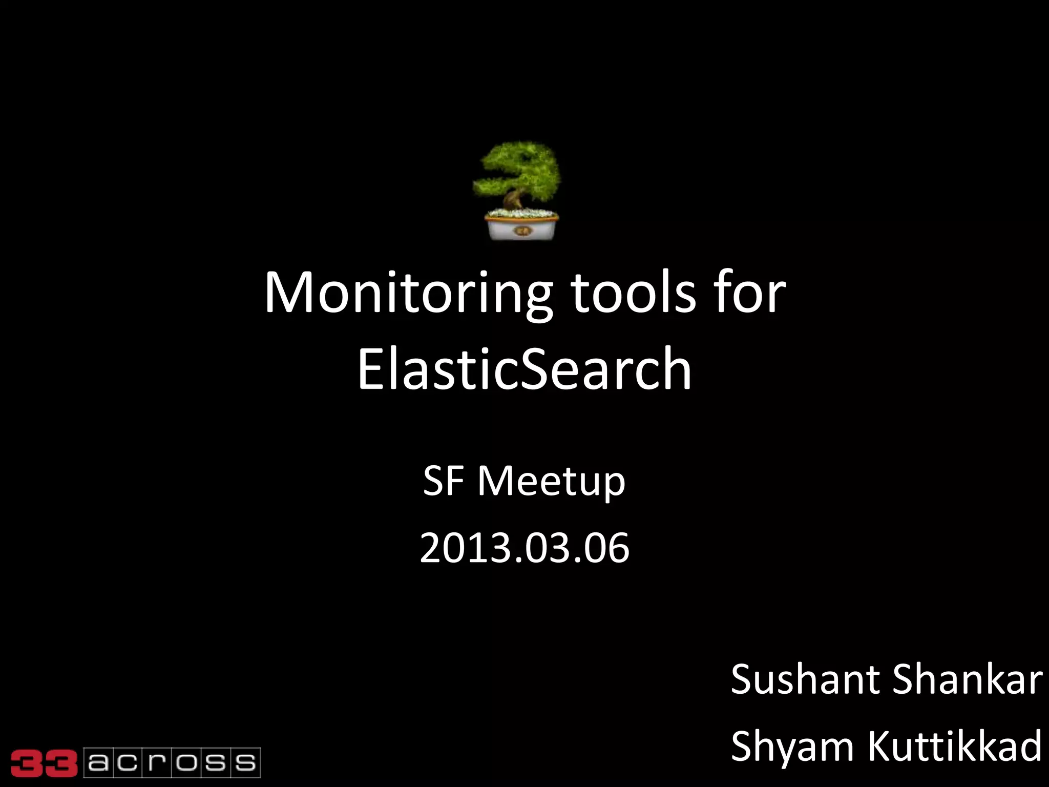 The document discusses monitoring tools for Elasticsearch, focusing on how they are utilized by a social sharing platform that assists over 600,000 publishers with content distribution and advertising. It details the technical setup of Elasticsearch, including hardware specifications, index building techniques, and the use of monitoring tools like Zabbix and SPM for performance insights. Additionally, it covers optimization strategies for indexing and query performance, as well as the importance of Elasticsearch in handling complex tasks like machine learning.