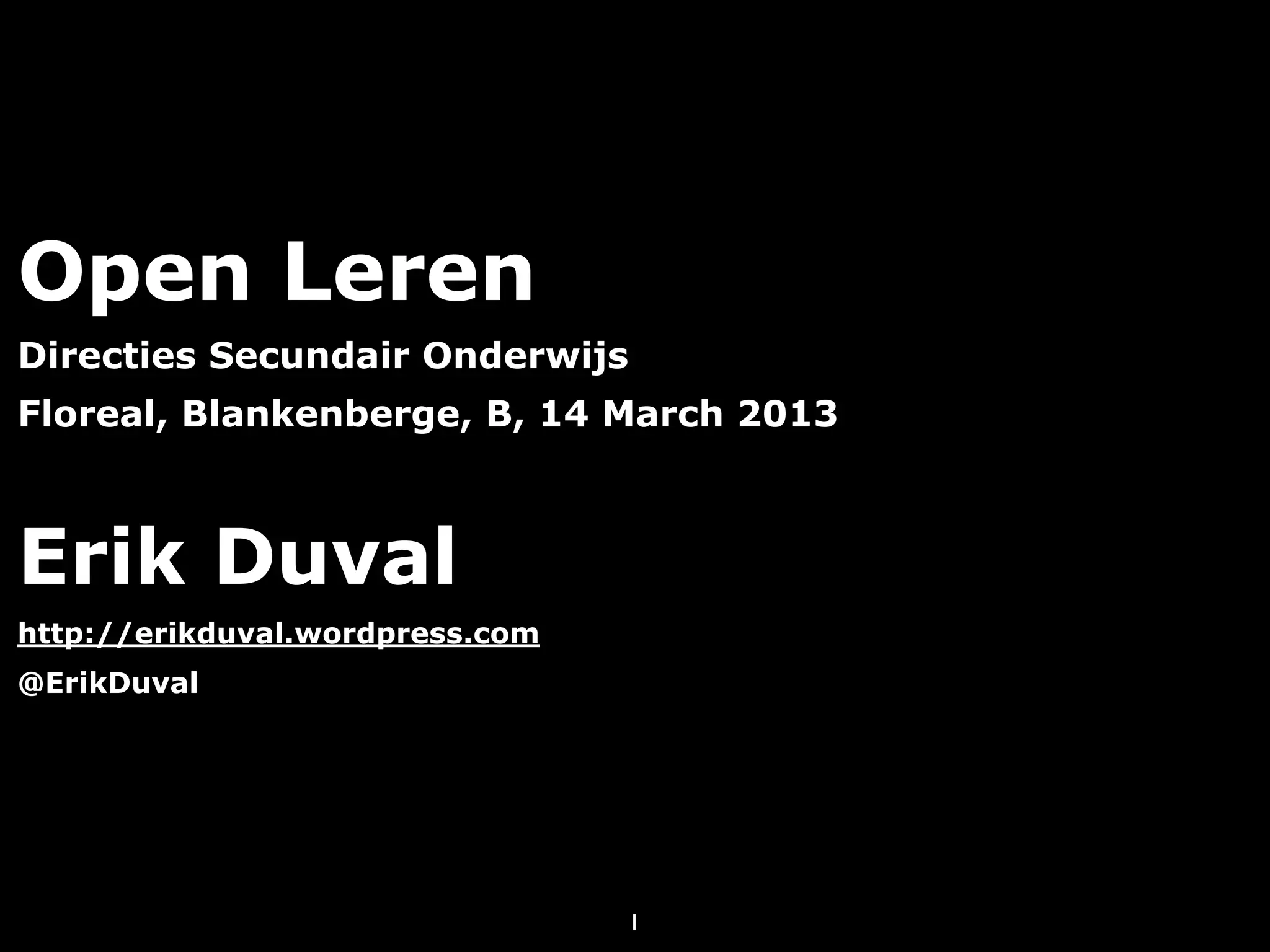 Erik Duval gave a presentation to secondary school directors on learning analytics and educational data mining. He discussed how technology can collect extensive data on student learning behaviors both online and offline. This data can provide insights into learning when analyzed and presented back to students and teachers through personalized dashboards. However, issues around student privacy, control over data collection, and introducing fear around monitoring must still be addressed for learning analytics to empower students.