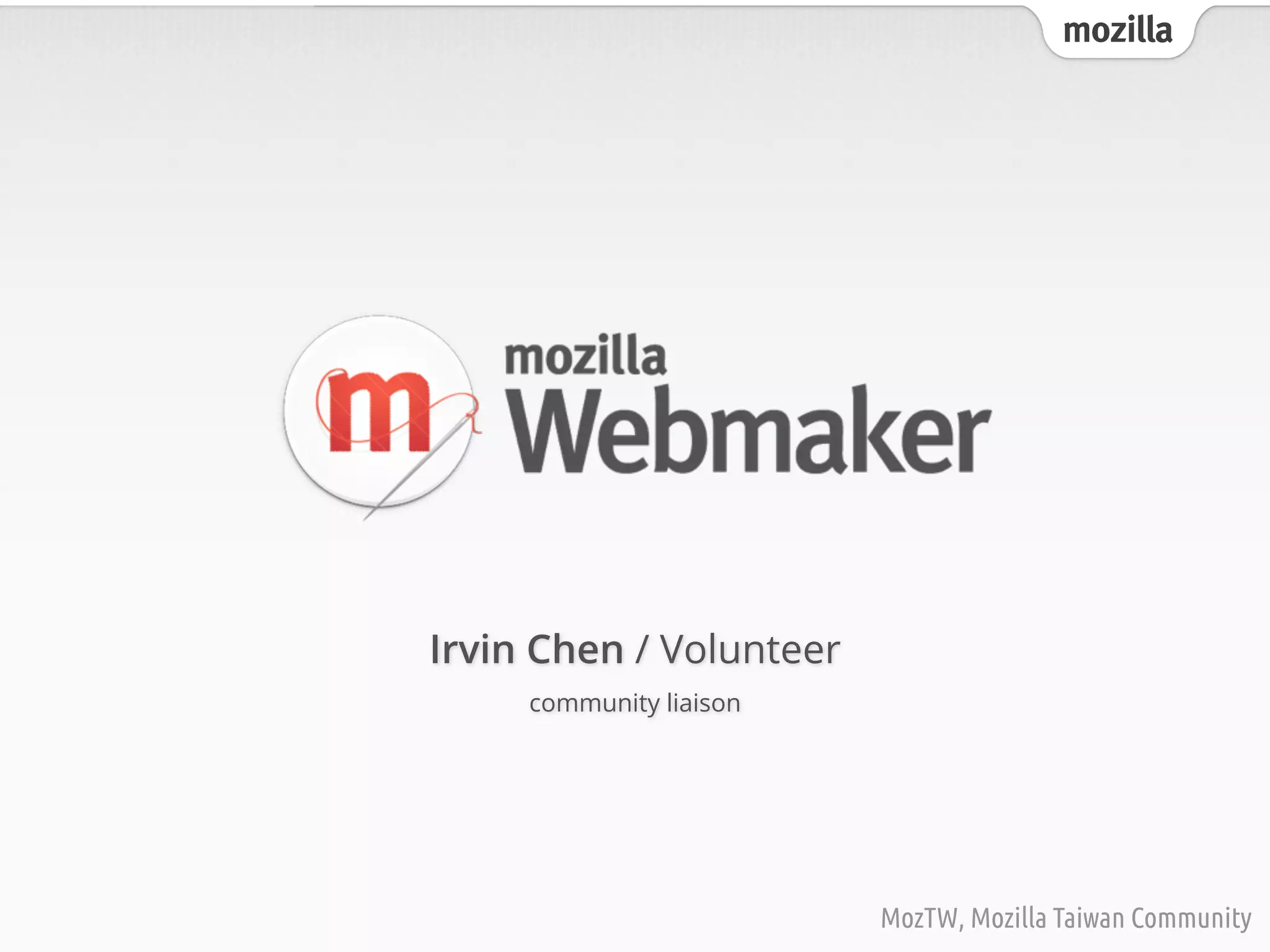 This document discusses Mozilla Taiwan Community (MozTW), a volunteer organization that promotes Mozilla's mission of openness, innovation, and opportunity on the web. It highlights several of Mozilla's webmaker tools that make it easy for people to create and remix web pages and videos, including Thimble, X-Ray Goggles, and Popcorn Maker. It also discusses Mozilla's efforts to teach webmaking skills through online and offline programs and kits, and recognize skills through a badges program. Events like the Maker Party are aimed at getting people engaged in learning and sharing webmaking skills.