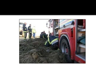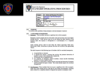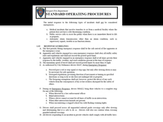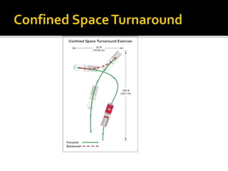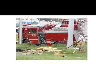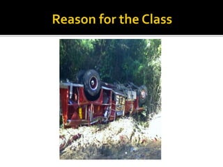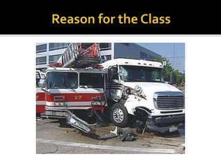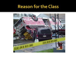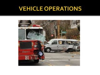 The document provides guidance for safely operating emergency vehicles. It outlines a comprehensive training program with four parts: driving regulations, safety tips, defensive driving techniques, and a driver awareness course. Historically, many firefighter fatalities have resulted from vehicle accidents. The training stresses prevention through policies like mandatory seatbelt use. Drivers and officers are both responsible for crew safety and can be liable for inadequate training. The document reviews common causes of collisions and techniques for defensive driving.