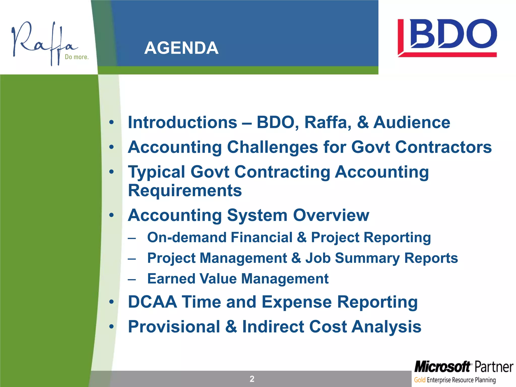 The document outlines a seminar focused on financial and project management systems for government contractors, detailing topics such as accounting challenges, DCAA reporting, and business system compliance. It emphasizes the importance of integrated solutions, like Microsoft Dynamics, in managing contracts and costs effectively while navigating regulatory requirements. Additionally, it discusses best practices for time and expense management systems to ensure accurate reporting and compliance.