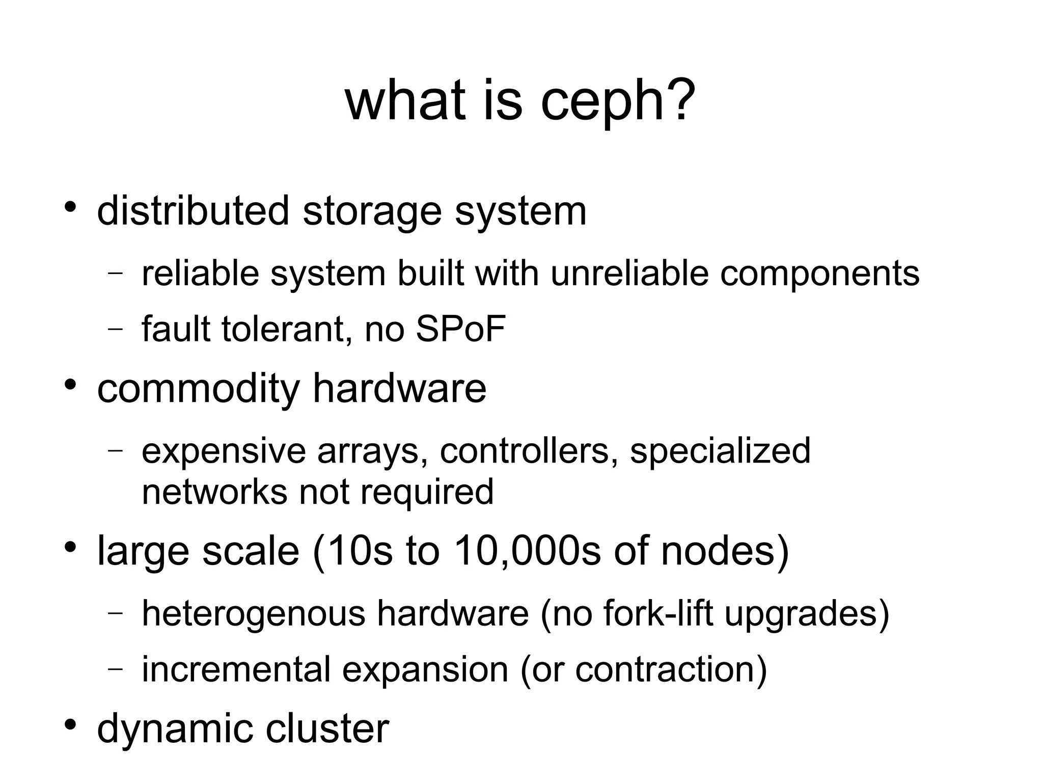Ceph is an open-source distributed storage system that provides scalable object, block, and file storage in a single unified platform. It uses a technique called CRUSH to automatically distribute data across clusters of commodity servers and provides self-healing capabilities through data replication. Ceph's unified storage platform includes RADOS, an object store; RBD for block storage; CephFS for distributed file storage; and RADOSGW for cloud storage compatibility. It is designed for large-scale deployments of 10s to 10,000s of nodes using heterogeneous hardware.