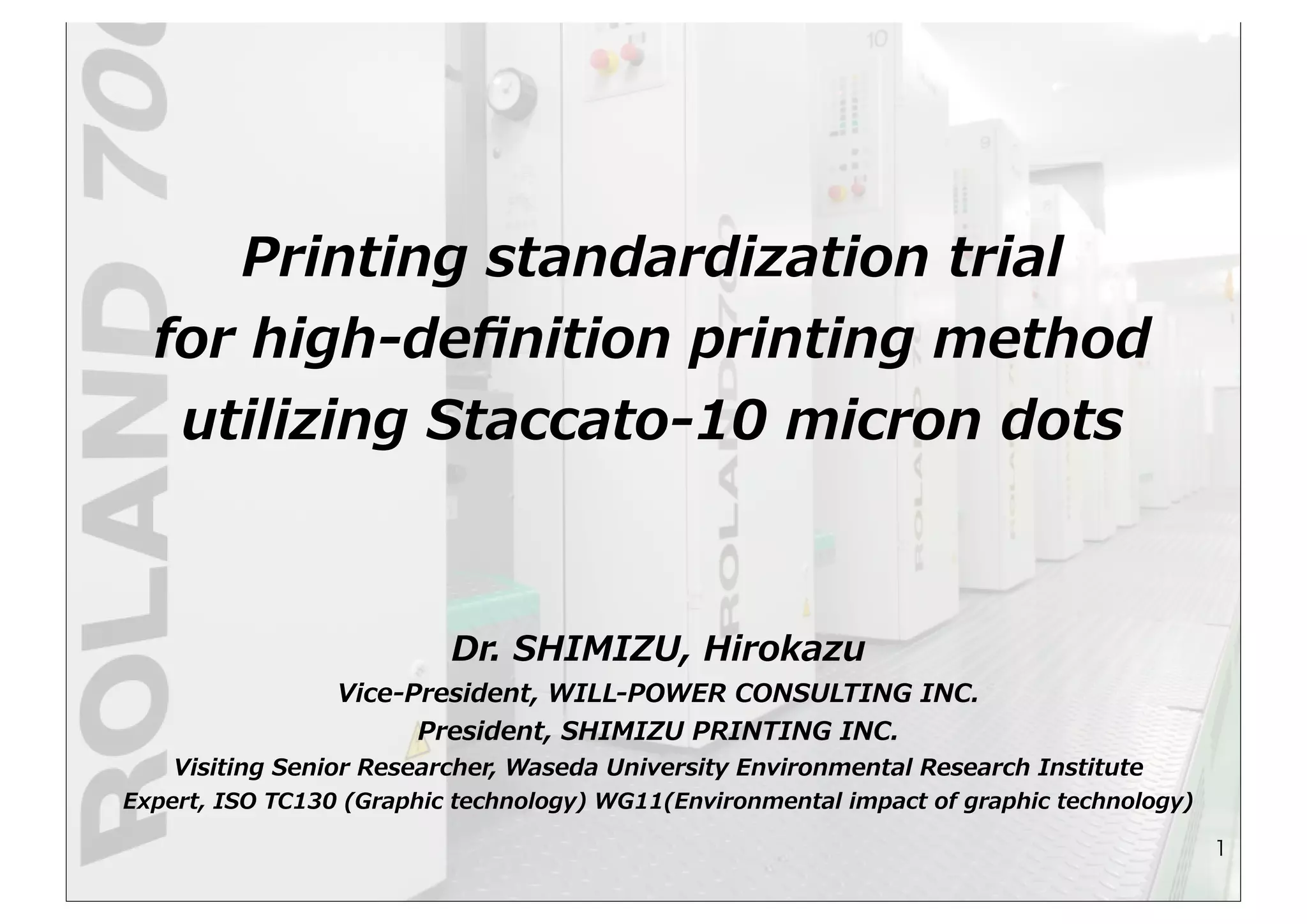This document summarizes the results of a printing standardization trial conducted by Dr. Shimizu to analyze high-definition printing using 10-micron Staccato dots. Analysis was performed using Kodak's ColorFlow analyzer and focused on color matching for different standards and proofs, as well as between different presses. The trial found average color differences of 3.3 with some areas needing adjustment to improve trapping values and gamut. Dr. Shimizu concluded continuous quality analysis is important to empower quality experts and ensure assistance from Japanese suppliers supports high printing quality.