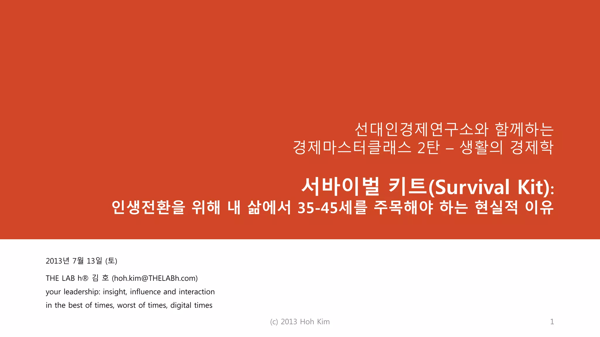 선대인경제연구소에서 주최한 '경제마스터클래스' 2탄에서 진행한 '서바이벌키트: 인생전환을 위해 내 삶에서 35-45세를 주목해야 하는 현실적 이유' 자료입니다. 강연시간은 70분(1700-1810)이었지만, 강연은 20분 정도였고, 50분은 참석자분들이 실제 레고로 전문성을 표현해보는 등 미니 워크샵 형태로 진행하였습니다.