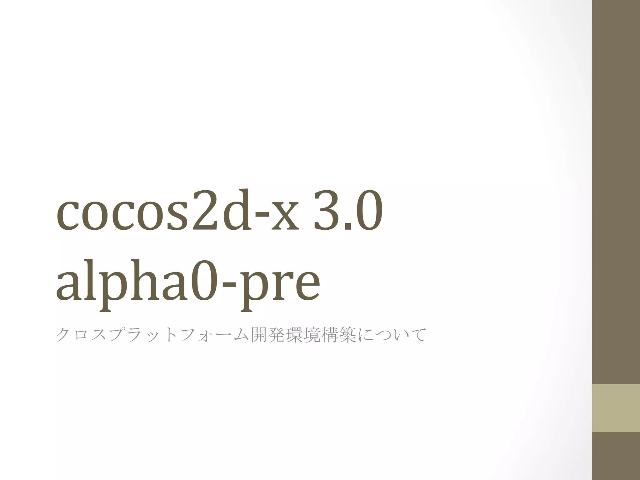 • cocos2d-‐xの開発環境を整える • iOS • Android • テンプレートプロジェクトから学ぶ • 今後の勉強方法について