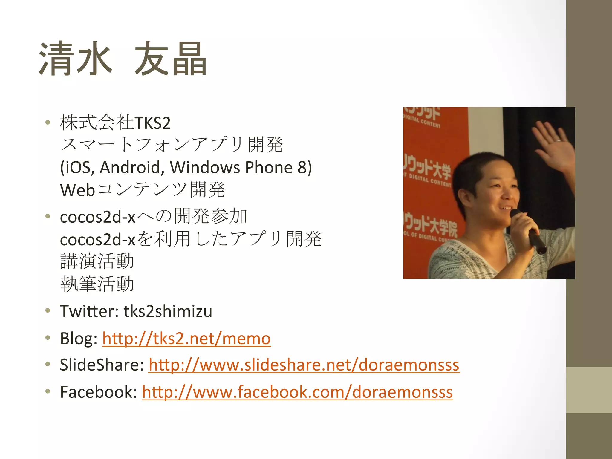 株式会社TKS2 スマートフォンアプリ開発 (iOS, Android, Windows Phone 8) Webコンテンツ開発 • cocos2d-‐xへの開発参加 cocos2d-‐xを利用したアプリ開発 講演活動 執筆活動 • Twi;er: tks2shimizu • Blog: h;p://tks2.net/memo • SlideShare: h;p://www.slideshare.net/doraemonsss • Facebook: h;p://www.facebook.com/doraemonsss