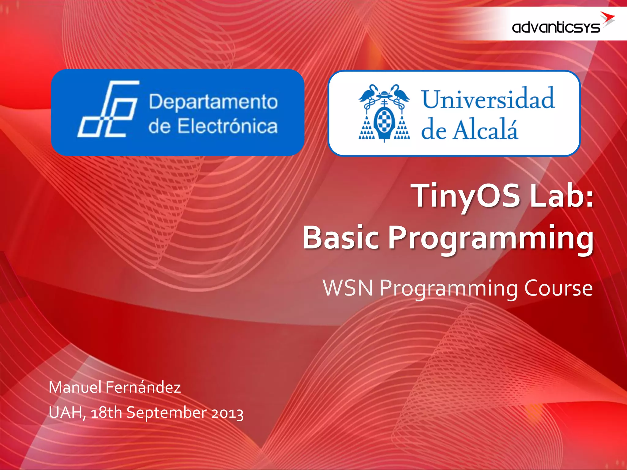 The document is a basic programming manual for a WSN programming course using TinyOS and NESC. It introduces the structure of NESC applications, detailing components, interfaces, and file types, along with instructions on compiling and using the Eclipse IDE for programming. The document also includes exercises and contact information for the author.