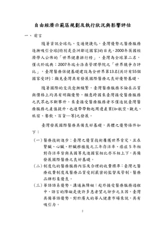 本報告探討臺灣自由經濟示範區的國際醫療產業策略,強調臺灣在醫療服務的品質與價格上的優勢,吸引國際患者。推動計劃旨在突破法規限制,提升醫療服務品質及產業聚落效應,促進周邊產業的發展。同時,報告提出一系列措施以保障國內醫療資源不受影響,確保醫療服務的品質與病人權益。