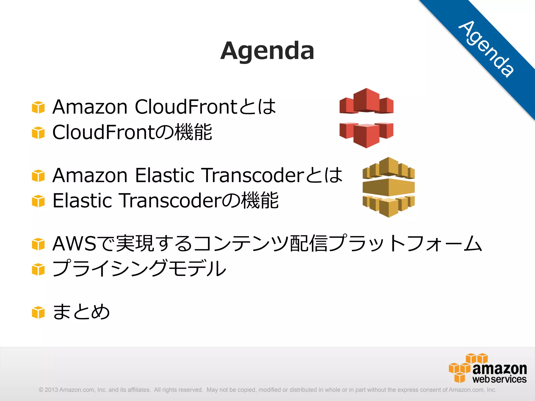 CloudFront Webサイトの⾼高速化とスケーラビリティが簡単に実現 • キャッシュのオフロード率率率の向上が有効活⽤用のキーポイント • 流流量量ベースの従量量課⾦金金により、⼩小規模から⼤大規模なサイト全て で活⽤用が可能 • アクセス数などのキャパシティプランからの開放 ! Amazon Elastic Transcoder 様々なデバイスに、より簡単に⾼高品質な動画を提供可能 • ⼿手間のかかるインフラ運⽤用からの完全脱却 • 必要なときに必要なだけ低コストで利利⽤用可能 © 2013 Amazon.com, Inc. and its affiliates. All rights reserved. May not be copied, modified or distributed in whole or in part without the express consent of Amazon.com, Inc.