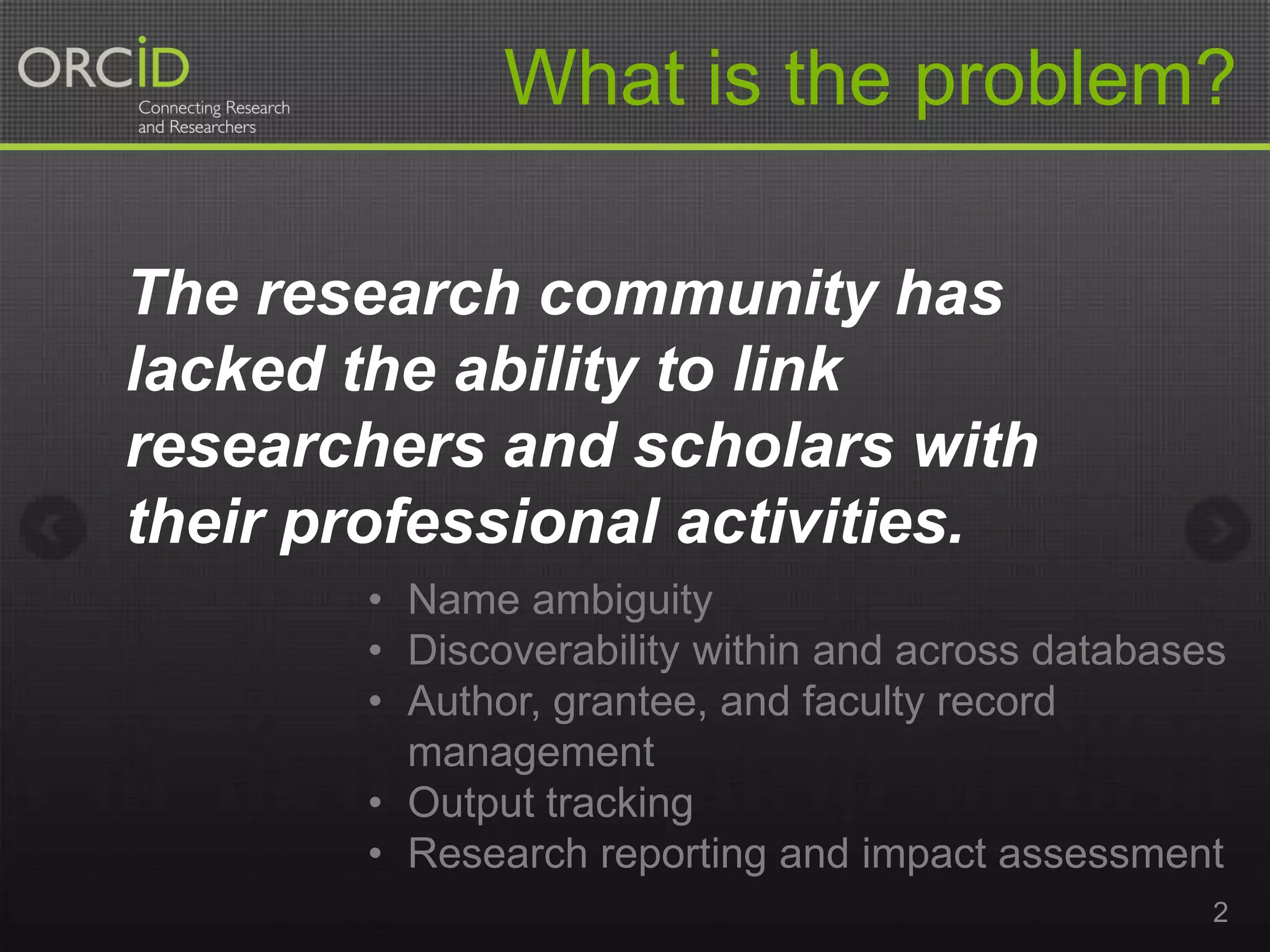 - ORCID provides a unique identifier for researchers and links their activities such as publications, grants, and affiliations. This helps solve the problem of name ambiguity and allows improved discoverability of researchers' work.