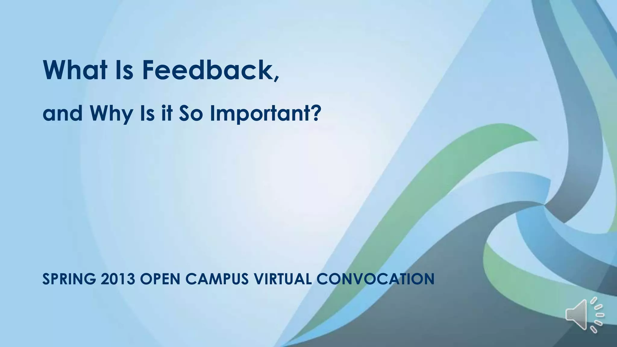This document discusses the importance of feedback for online students. It begins by presenting a scenario where a student does not receive feedback for two weeks on an assignment. It then defines feedback as evaluative information that helps improve performance. The document explains that feedback is especially important for online students because it represents one of their only interactions with instructors. Research shows that online students crave interaction and feedback in order to feel engaged and be more likely to persist in their studies. The document recommends that instructors provide feedback that is timely, personalized, engaging, and models critical thinking. It presents research linking feedback to increased student success and persistence.