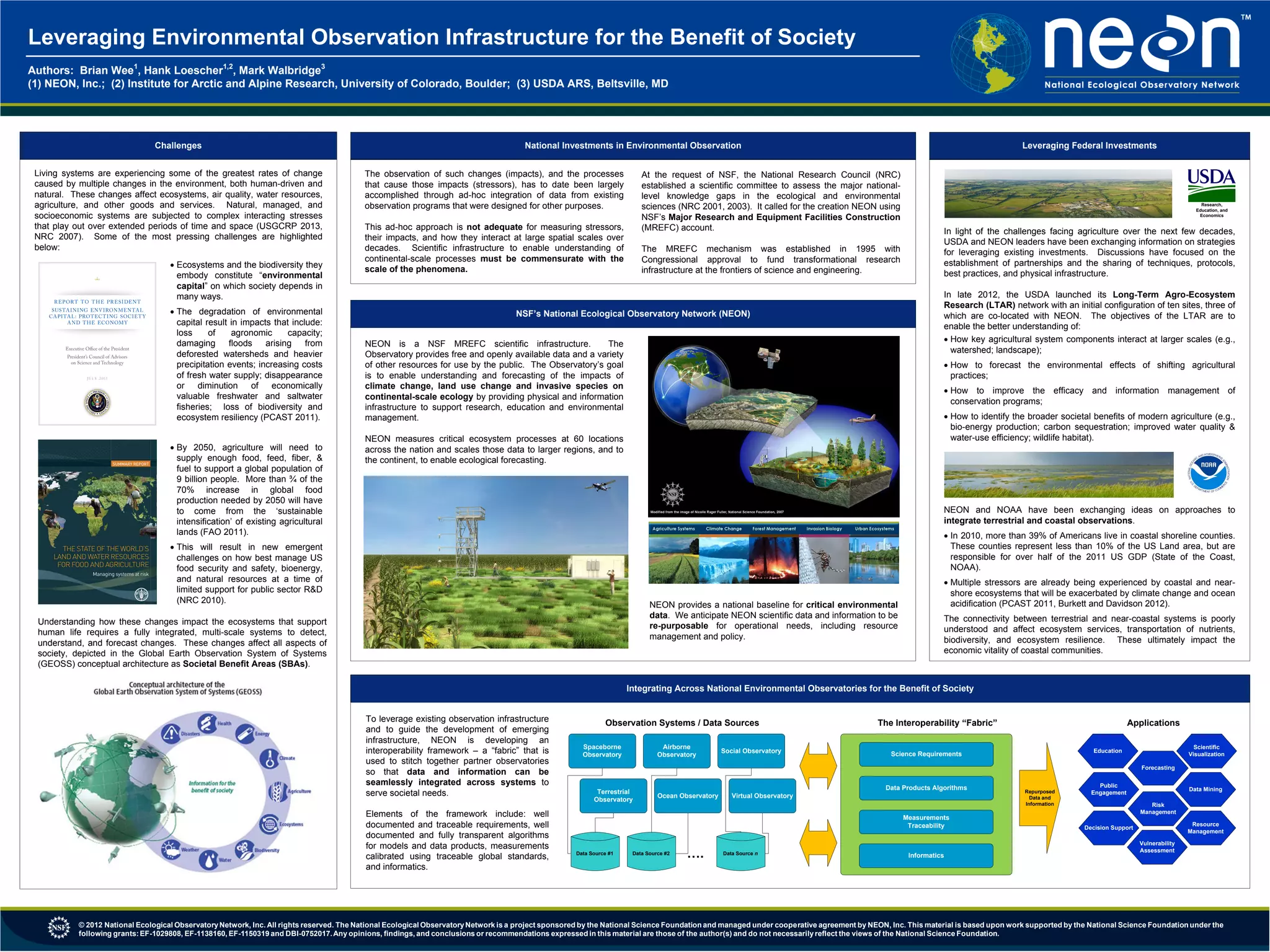The document discusses the urgent challenges posed by environmental changes on ecosystems, agriculture, and society, highlighting the need for effective environmental observation infrastructure. It emphasizes the role of NEON (National Ecological Observatory Network) in providing critical data for understanding and forecasting ecological impacts, particularly regarding climate change and land use. Additionally, it outlines partnerships between NEON and USDA to enhance research capabilities and address agricultural sustainability in the face of a growing global population.